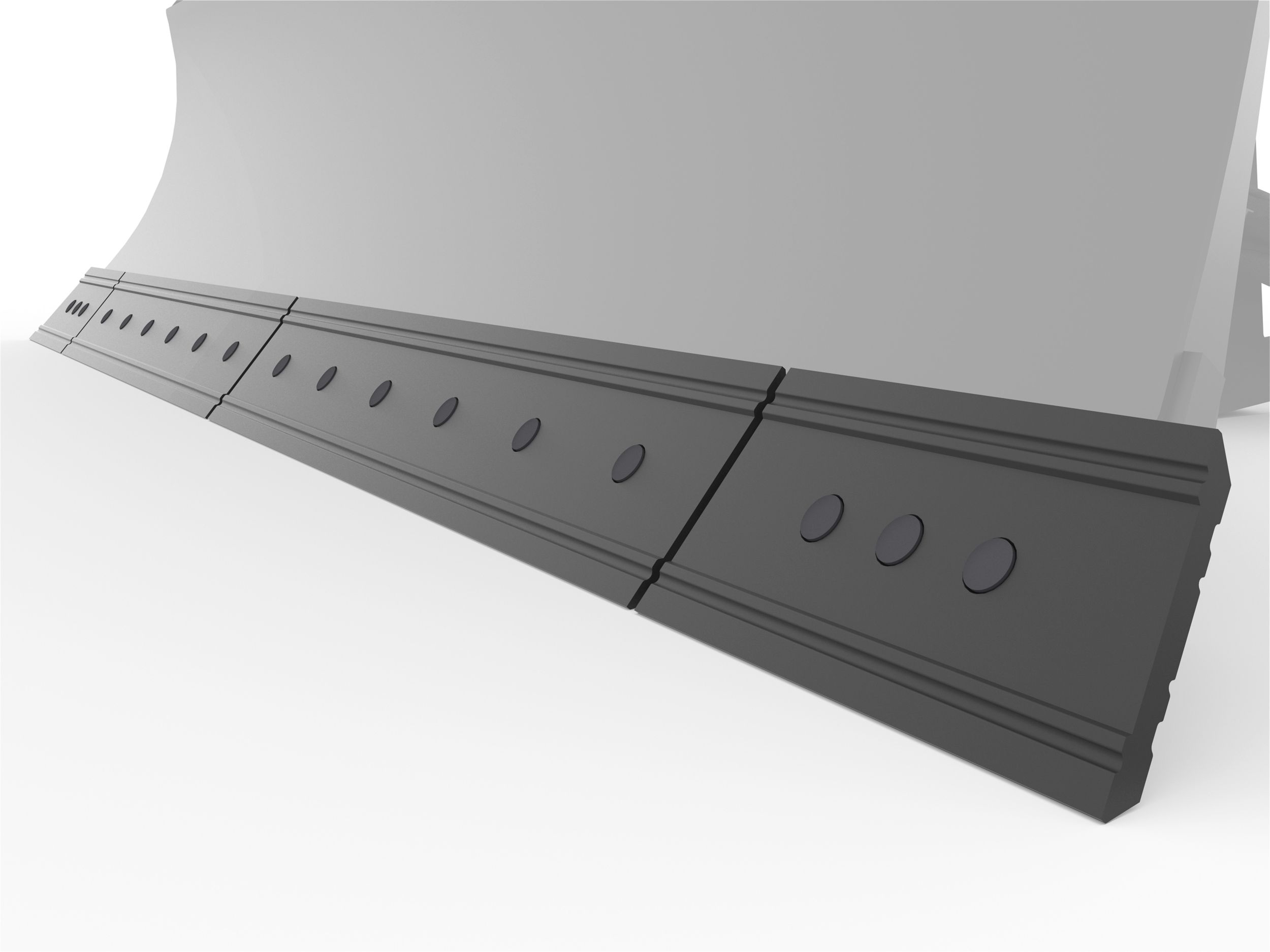 Four replaceable, bolt-on, cutting edges ensure a long service life of the blade. Wear indicator bars on cutting edges provide a visual indication of remaining cutting-edge life. Center cutting edge sections can be flipped for double life.