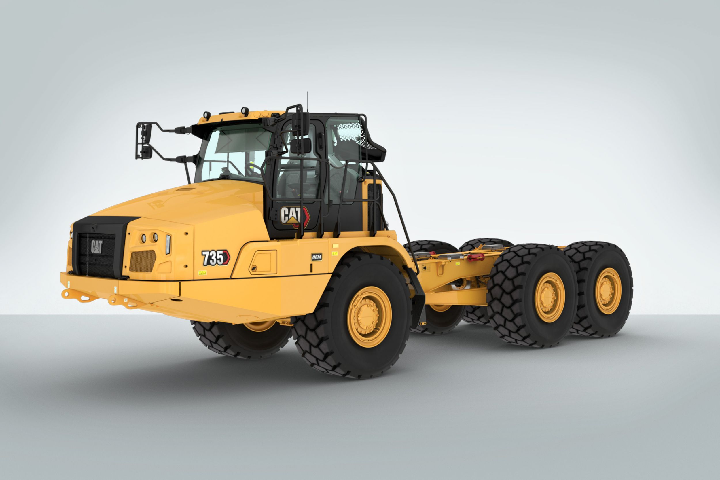 The Cat® OEM 735 Bare Chassis is available in both standard and long wheel base. With up to a 32 tonnes (35.3 tons) capacity, the 735 bare chassis offers proven reliability, durability, high productivity, superior operator comfort and lower operating costs. The long wheel base configuration accommodates longer specialty OEM bodies, while retaining high-quality steering, braking, and ride characteristics.Cat chassis are the right choice for specialty truck bodies (coal, trash), water trucks, fuel and lube, service vehicles, container carriers, hook lifts and other machine derivatives. These specialty machines have proven themselves in construction, industrial, waste, material handling, quarry, and mining projects worldwide.The Cat® OEM 735 Bare Chassis is available in both standard and long wheel base. With up to a 32 tonnes (35.3 tons) capacity, the 735 bare chassis offers proven reliability, durability, high productivity, superior operator comfort and lower operating costs. The long wheel base configuration accommodates longer specialty OEM bodies, while retaining high-quality steering, braking and ride characteristics.